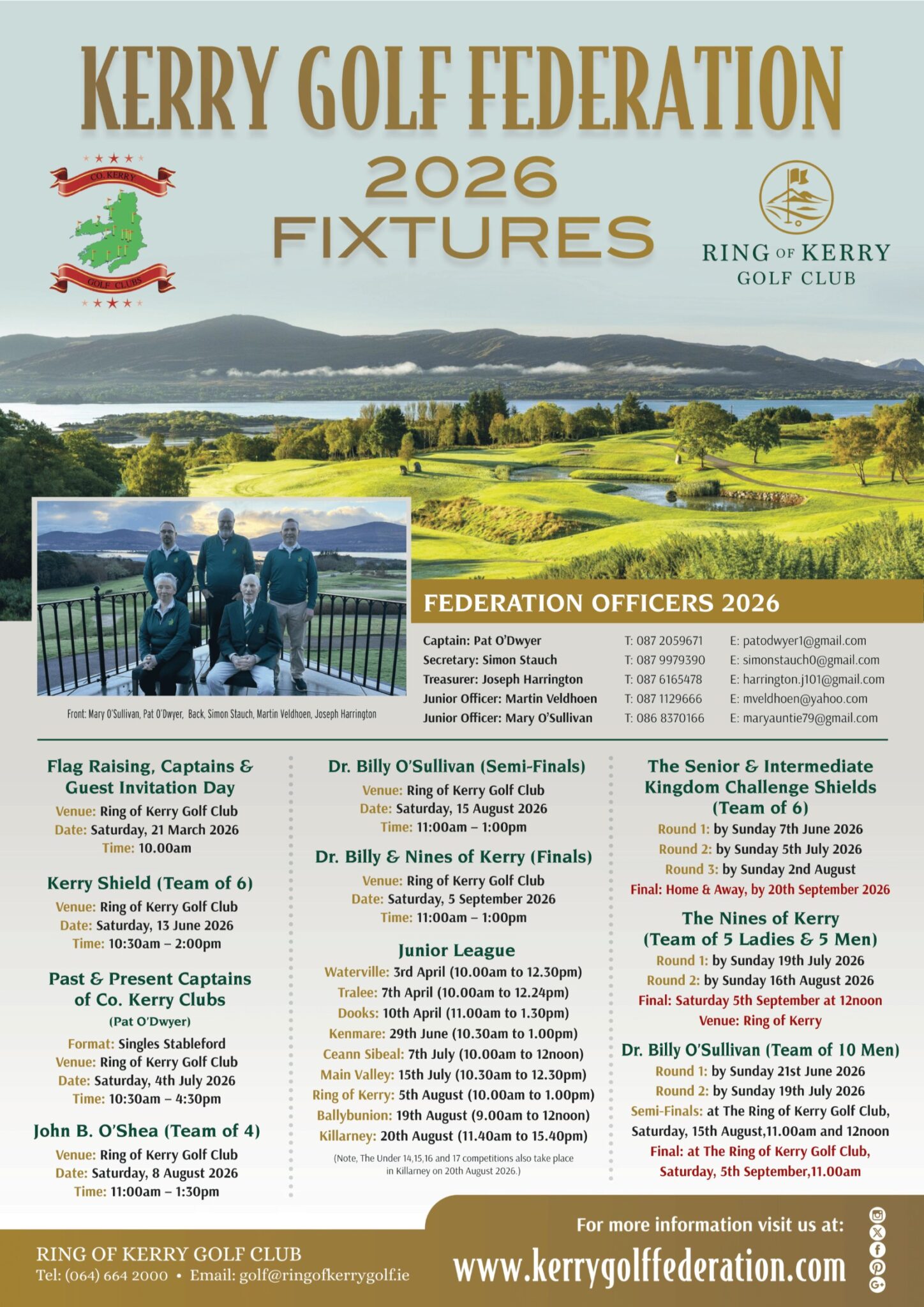 Each year Kerry U18 golfers compete in the Kerry Junior League which is completed over a number outings held on Kerry Golf Courses. At each outing Kerry clubs are represented by a team of 7 golfers with the best 5 stableford scores to count towards the teams score. The winning team is the one with the most accumulated points after the final outing has been completed. The maximum handicap index allowance is 24.4.